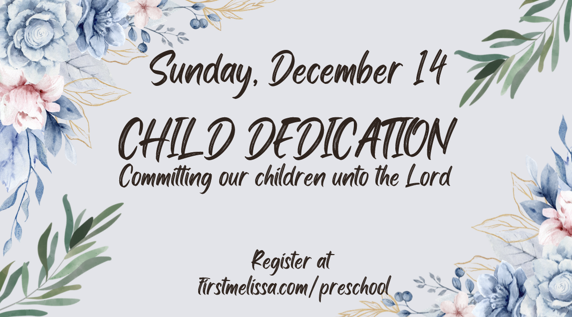 CHILD DEDICATIONCHILD DEDICATION Event Coordinator •Reinalee Cox Download Event Previous PageDetailsDateSunday, December 14, 2025Time12:00am - 12:00amRegister